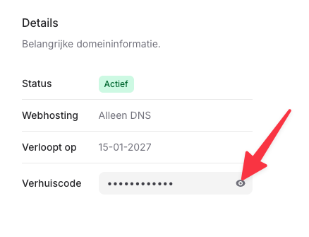In het Details blok zie je de regel Verhuiscode. De code is verborgen achter sterretjes.