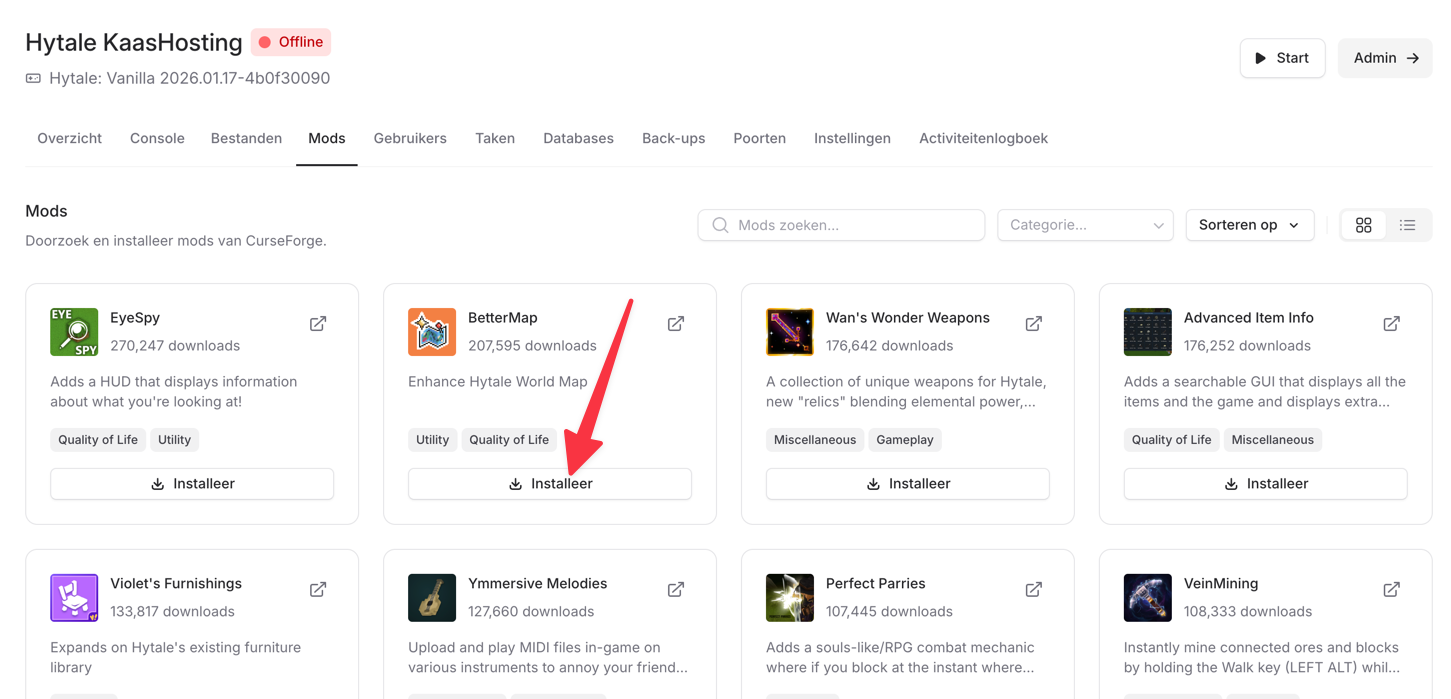 Klik op Installeer bij de mod die je wilt toevoegen.