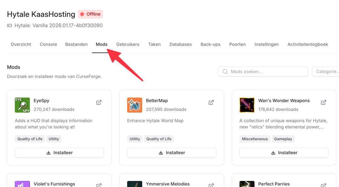 Blader door de beschikbare mods of gebruik de zoekbalk om een specifieke mod te vinden. Je kunt ook filteren op categorie.