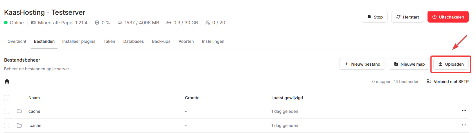 server.jaren verwijder deze.Klik op uploaden en kies jouw eigen jar bestand vanaf je computer. Wacht tot het uploaden voltooid is.