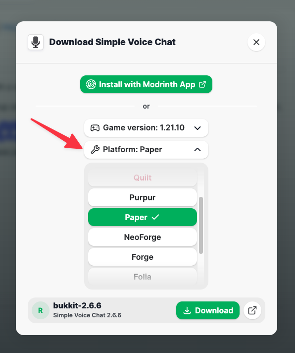 Ga naar de officiële pagina van Simple Voice Chat en download de versie die past bij jouw server type. Voorbeeld: draait jouw server Paper? Kies dan voor Paper onder platform.