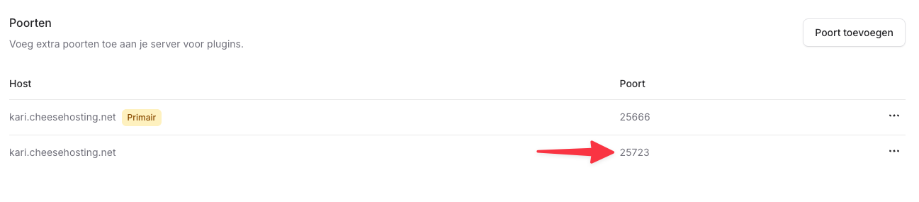 Klik op poort toevoegen om de poort aan je server toe te voegen. Zodra de poort is toegevoegd verschijnt hij onder het kopje poorten met het gekozen nummer. Kopieer dit nummer, dit is de poort die we straks in de configuratie gaan gebruiken.