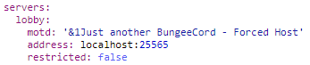 servers:gedeelte. Hier staat standaard een voorbeeldserver genaamd "lobby". Dit blokje ga je aanpassen en kopiëren voor elke server die je wilt koppelen.