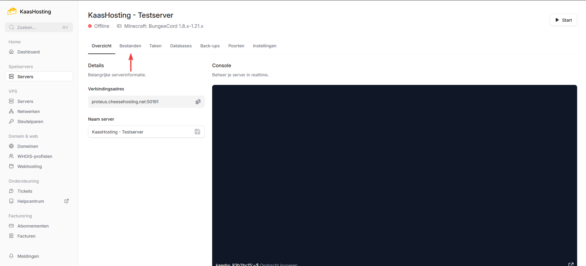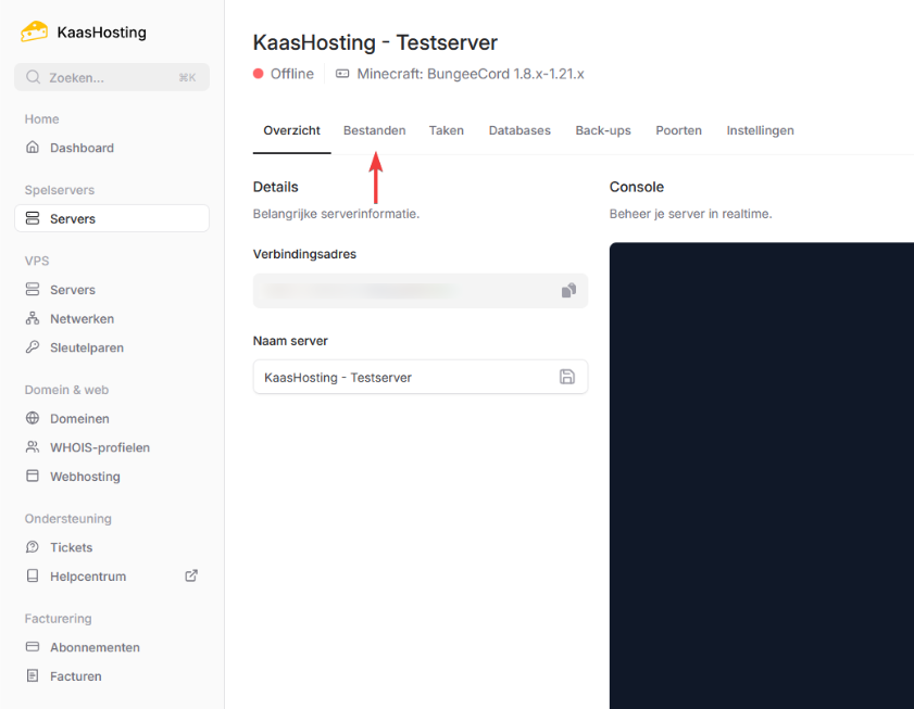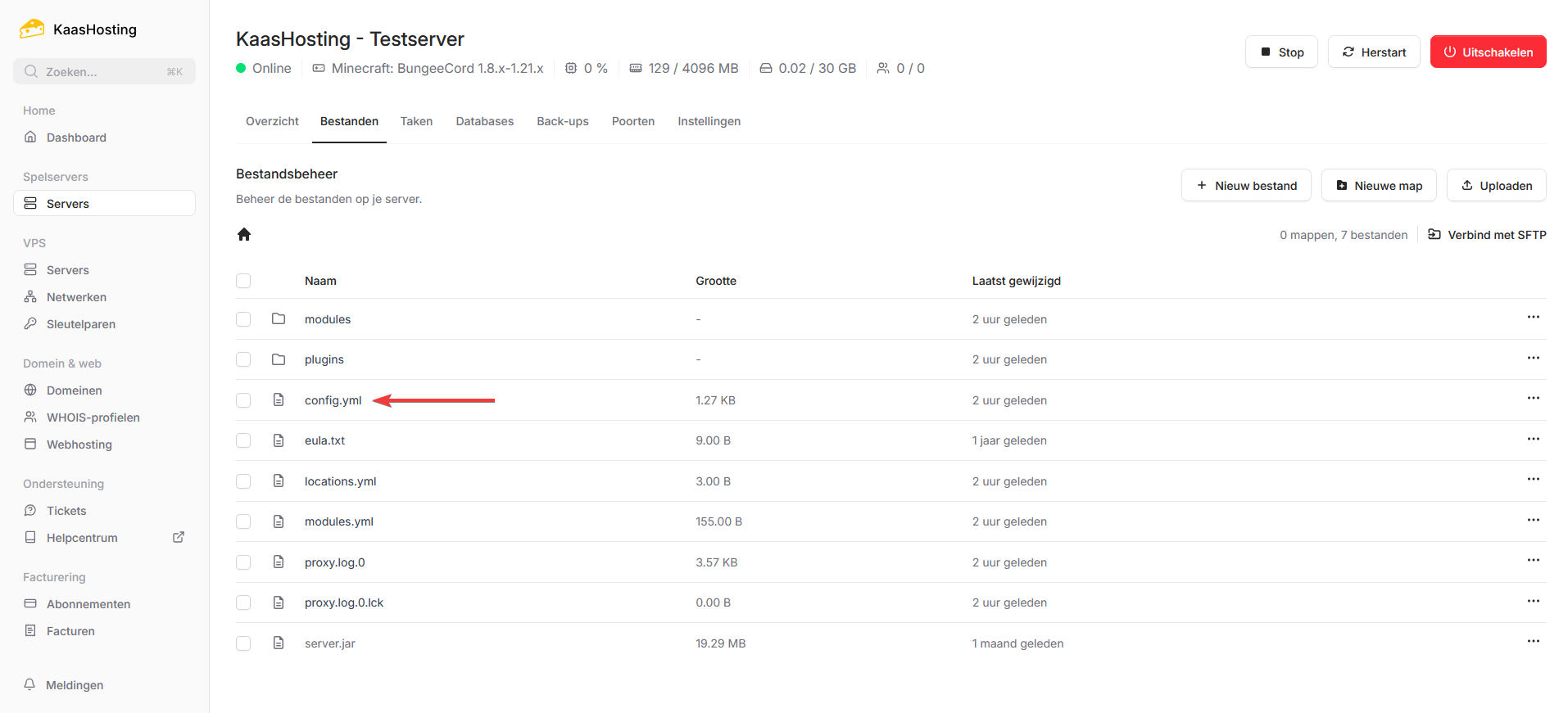 Ga naar het controlepaneel en klik op je BungeeCord server.
