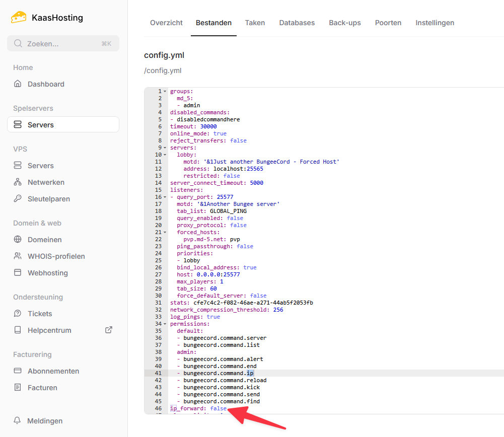 ip_forwarden verander deze vanfalsenaartrue. Dit zorgt ervoor dat de echte IP-adressen van spelers worden doorgestuurd naar je servers.