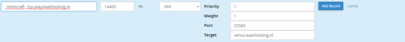 _minecraft._tcp.play.jouwdomein.nl.. Let op dat jejouwdomein.nlvervangt voor jouw eigen domeinnaam.Vul bij TTL