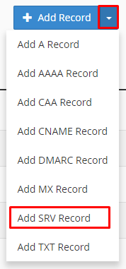 Klik op het pijltje naast Add Record en selecteer in het menu dat verschijnt Add SRV Record.