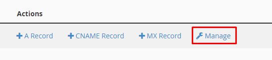 Klik op Manage bij het domein dat je wil gebruiken voor een custom Minecraft server IP.