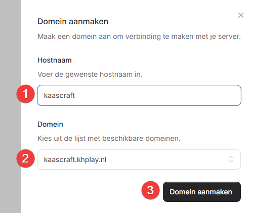 Bij KaasHosting krijg je gratis een khplay.nl subdomein bij jouw Minecraft server. Je kan zelf de hostnaam kiezen, bijvoorbeeld jouwnaam.khplay.nl.