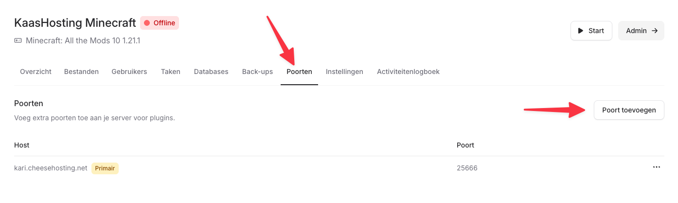 Klik in de navigatiebalk van het controlepaneel op poorten. Hier zie je een knop om extra poorten toe te voegen.