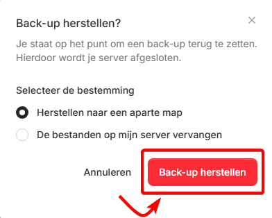 ⚠️ Let op: Als je kiest voor deze optie wordt jouw huidige servermap volledig overschreven. Maak een eigen back‑up als je iets wilt bewaren.