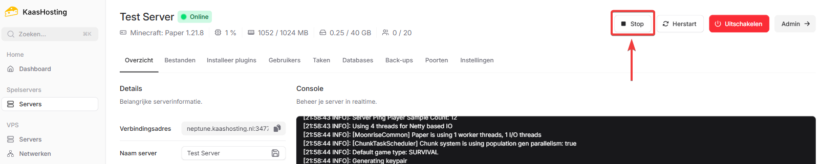 Zet de server uit door op stop te klikken.