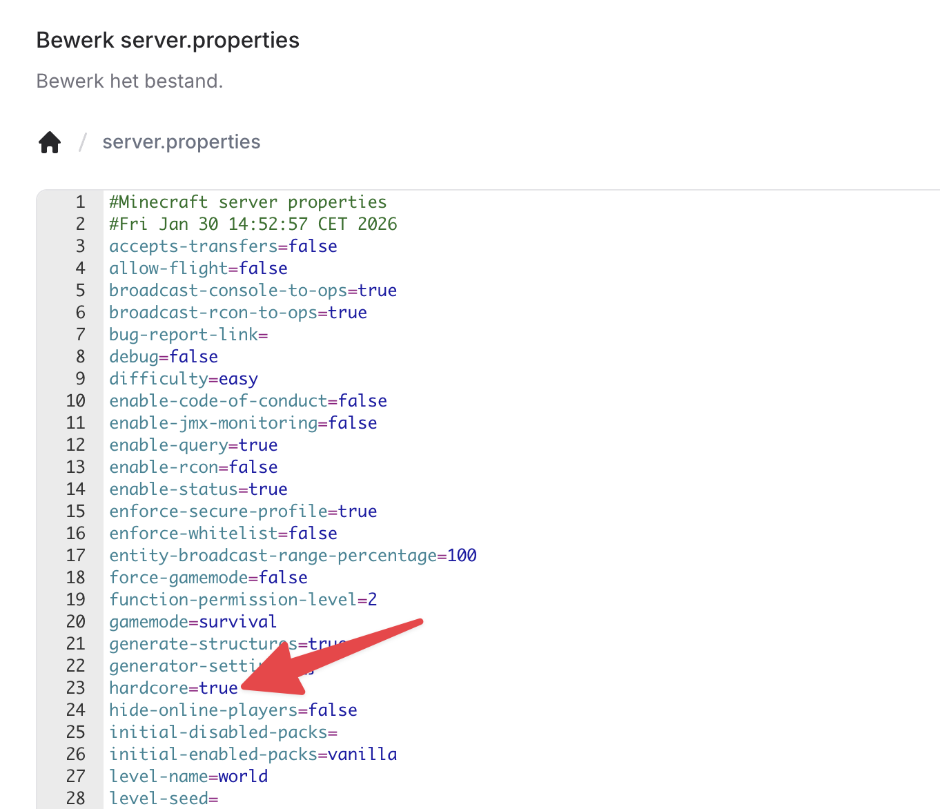 In hardcore modus speel je Minecraft op de moeilijkste difficulty met één groot verschil: als je doodgaat, kun je niet respawnen. Dit maakt het spel een stuk spannender. In dit artikel leggen we uit hoe je hardcore aanzet op je server.