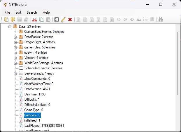 level.datuit deworldmap via Bestanden.Open het bestand met NBTExplorer (gratis programma voor Windows/Mac/Linux).