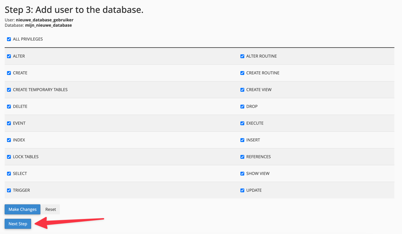 Geef de gebruiker de juiste rechten op de database. Weet je niet welke rechten je nodig hebt? Vink dan ALL PRIVILEGES aan om de gebruiker volledige toegang te geven. Klik op Next Step.