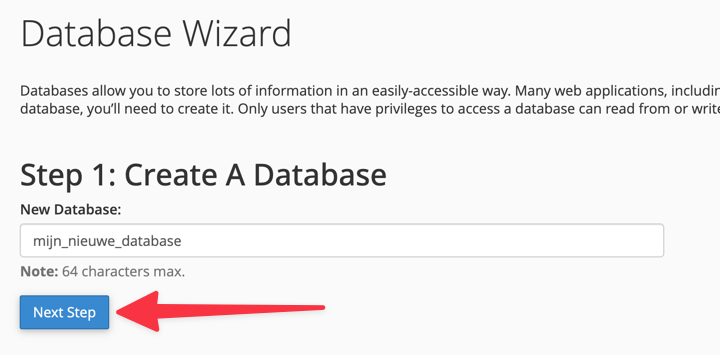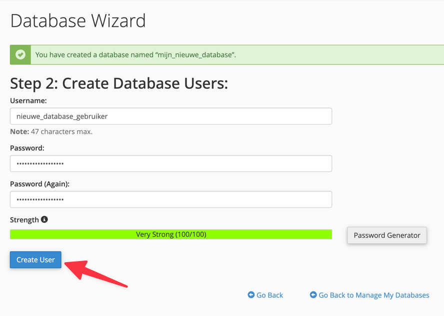 Database gebruiker: je cPanel-gebruikersnaam + underscore + de gebruikersnaam die je hebt gekozen