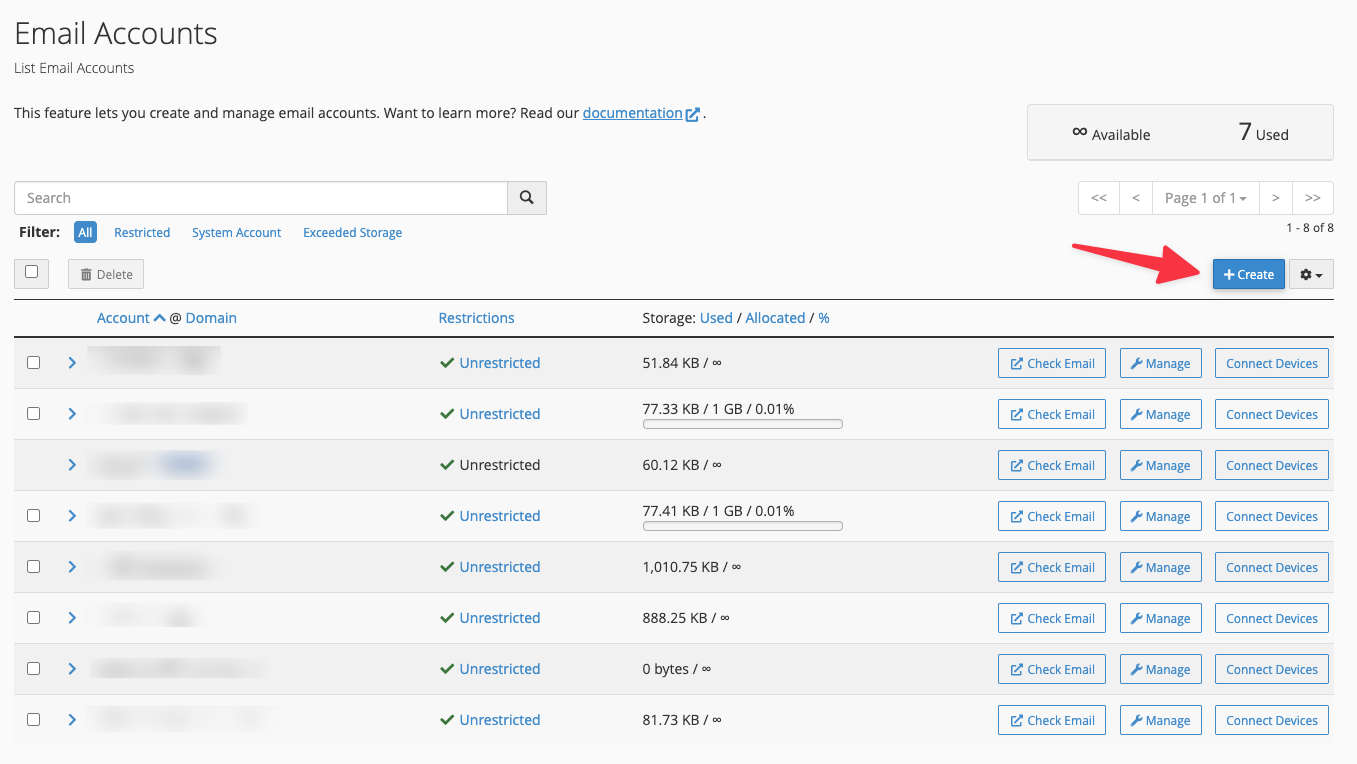 Ga in cPanel naar Email Accounts. Hier zie je een overzicht van al je e-mailadressen. Klik op Manage naast het e-mailadres om het wachtwoord te wijzigen, of op Delete om het e-mailadres te verwijderen.